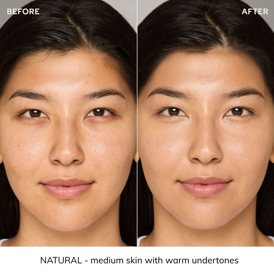 The formula delivers buildable medium-to-full coverage with a natural dewy finish — ideal for covering uneven tone, pores, and fine lines.