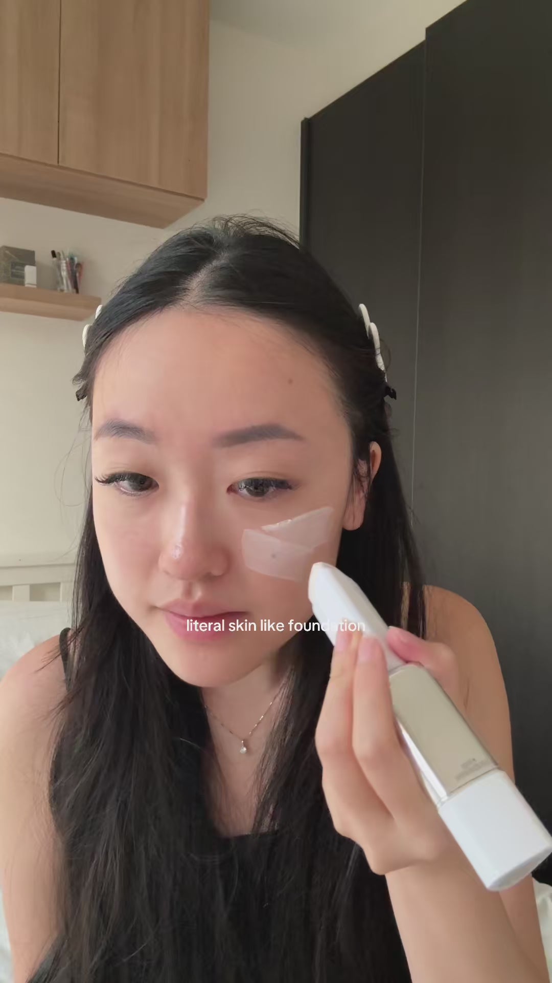 The foundation starts as a soft white cream with collagen capsules that burst as you blend, adapting to your natural skin tone for a seamless match.